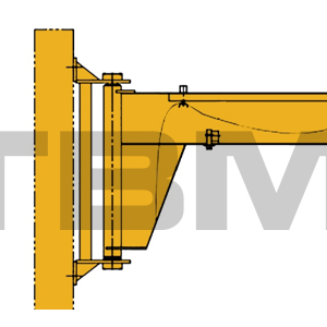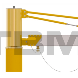 | Zaokretna os dizalice sa strelom od 270° nalazi se na dva uška iznad stupa. Između gornjeg i donjeg nosača i zakretne osi ugrađeni su ležajevi ravnih nosača i samopodmazujuće bakrene čahure. To osigurava fleksibilno zakretanje i prigušuje inercijsko njihanje kraka kada se zaustavi. Vanjska ograničenja kuta zakretanja predviđena su za podešavanje kuta zakretanja kraka. This structure effectively reduces the overall headroom of the jib crane. The 270° slewing mode is manual by default. |